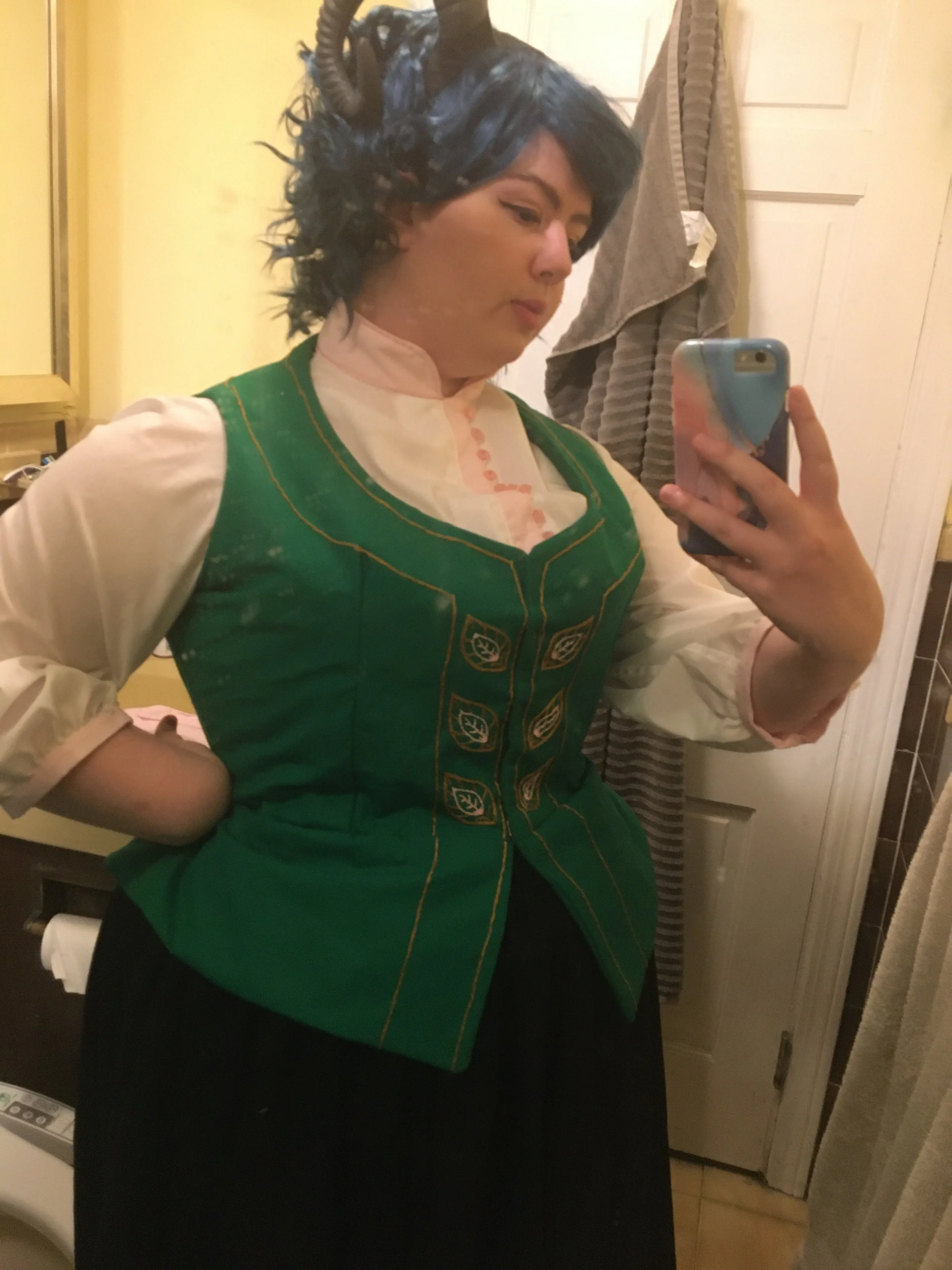 Blouse and waistcoat completed, a pre-makeup test. Waistcoat was a commecial men’s vest pattern with significant alterations for a stayed body and presence of a peplum.